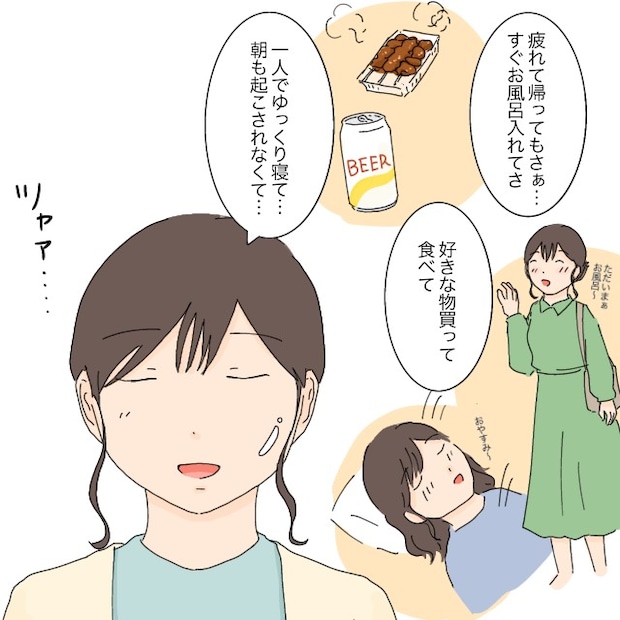 1人だと、疲れて帰ってもすぐお風呂に入れて、子どもたちを洗う手間もありません。好きなものを買って食べ、そのままゆっくり眠って、朝も誰にも起こされずに目覚める。そんな何気ないことで、私はこの上ない幸せを噛みしめていました。心なしか、肌のツヤまで良くなった気がします。
