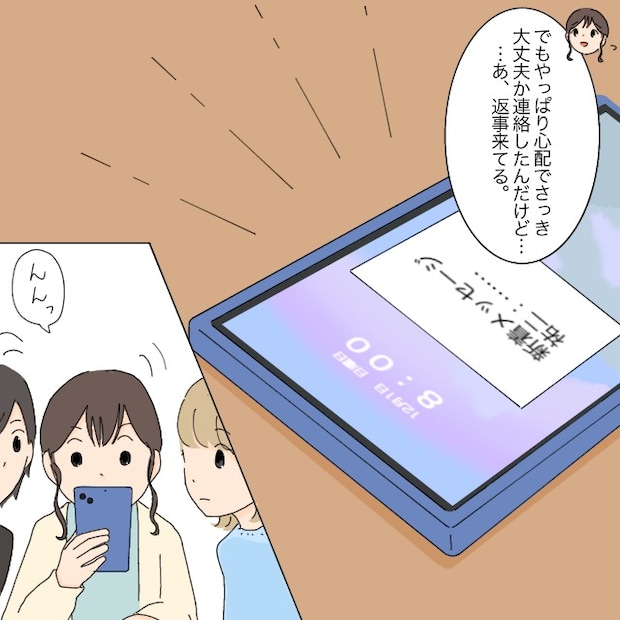 それでも、やっぱり子どもたちのことが気になってしまいます。1人で自由に過ごしていても、頭の片隅にはいつも子どもたちへの心配がありました。どうしても様子が知りたくなり、私は夫に子どもたちの様子をたずねます。スマホを見ると、ちょうど夫から返信が届いているようでした。ゆきとみゆも気になったのか、私のスマホをそっとのぞき込みます。