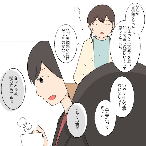 夫の要領の良さを目の当たりにした私は、「ちょっとは大変さを思い知って苦しめばいいって思ってたけど、私が要領悪いだけだったのかな・・・」とため息をつきます。母親として精一杯やってきたつもりでも、こんなにも簡単にこなされてしまうと自信を失ってしまいます。そんな私を見て、ゆきは「そんなことないでしょ!ひかりの凄さ、きっと今頃噛みしめてるよ」と優しく励ましてくれました。