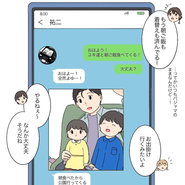 夫からは「おはよー!全然よゆー!」というメッセージと、着替えを済ませた子どもたちとの3ショットが送られてきていました。休日はいつもパジャマのままなのに、もう朝ごはんも着替えも完了していることにびっくり。しかも、これから公園に行く予定だなんて・・・。あの人、ちゃんとやればできるんだ!