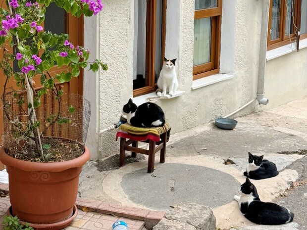 壁のつたや色あせた木の扉、花で彩られたバルコニーなど、写真に収めたくなる風景ばかり。そんな街角では、気ままに歩く猫たちにもよく出会います。人懐っこく、まるで島の住人のようにのんびりと日なたでくつろぐ姿に癒されることでしょう。