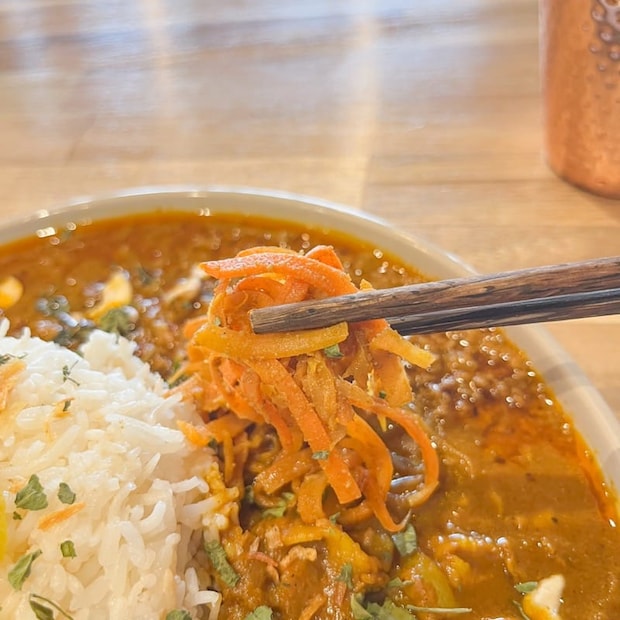 「サブジ」とはインド風の野菜のスパイス炒めのこと。にんじん本来の優しい甘みが引き出されていて、ポリポリとした程よい食感も絶妙なアクセントになっています。