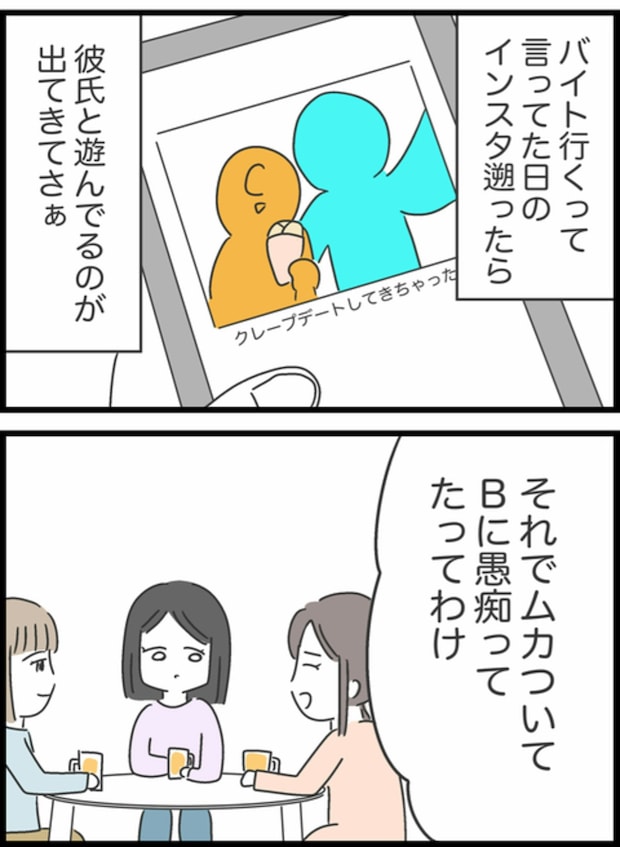 体調不良でバイトに出られなかったという言葉が信じられなかったAちゃんはCちゃんのSNSを遡って見てみることに。そこには彼氏と楽しそうに過ごすCちゃんの写真があげられていました。普段のCちゃんには何の違和感も持っていなかったAちゃんでしたが、SNSを見てCちゃんの本性を知ることに。
