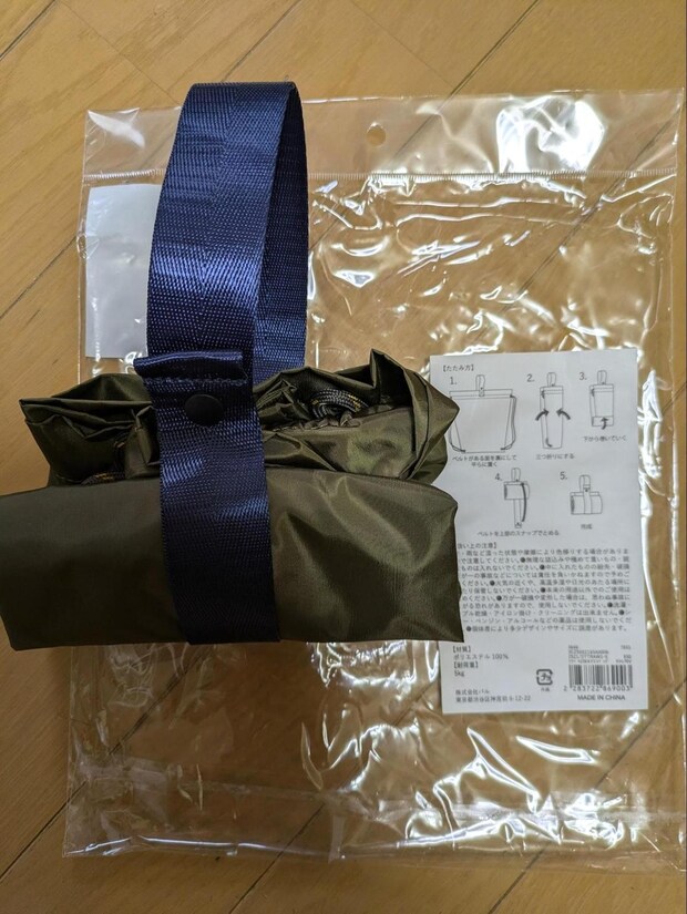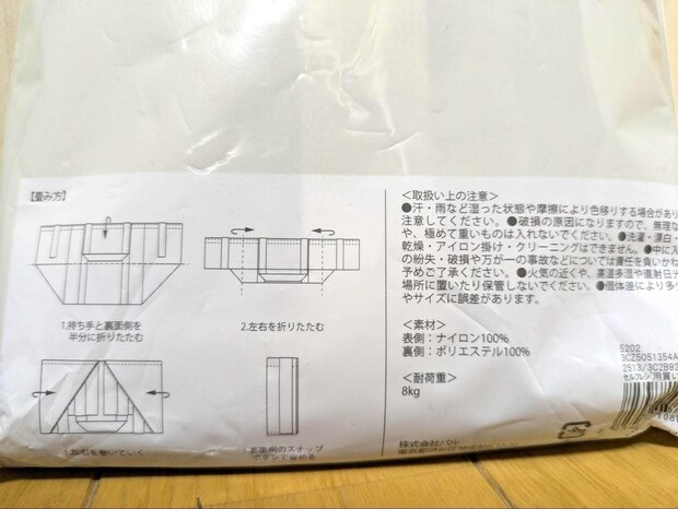 袋の裏面には、扱い方の注意や、畳み方が記載されています。