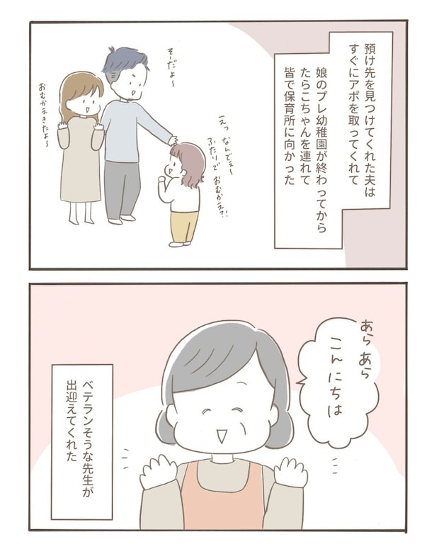 夫が見つけてくれた新しい預け先にさっそく説明を聞きに行くことに。出迎えてくれた先生はとても優しそうな雰囲気です。
