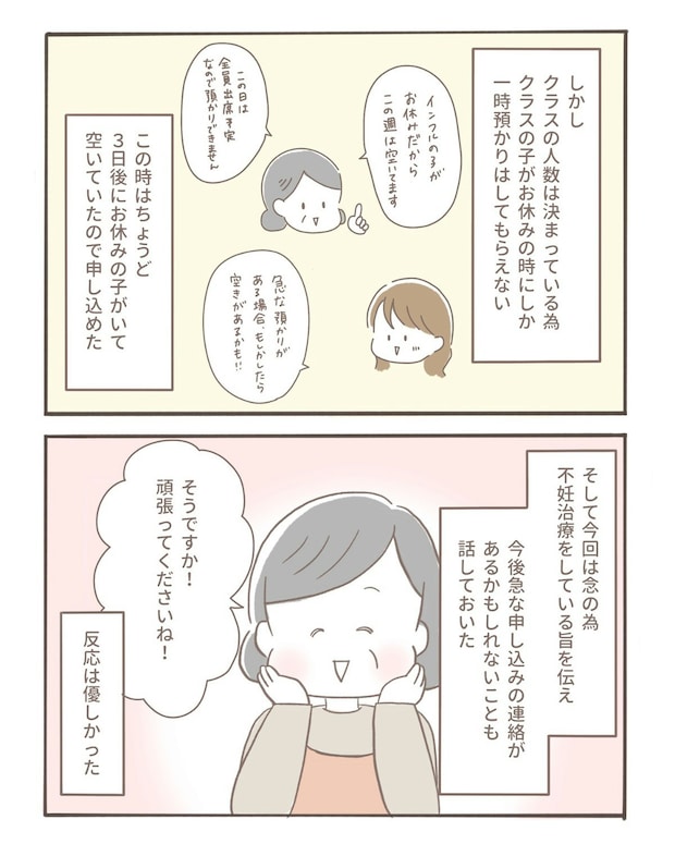 夫が見つけてくれた新しい預け先へ説明を聞きに行くと、先生はとても優しい雰囲気の方でした。不妊治療中で急な連絡になることも伝えると、「頑張ってくださいね」と温かい言葉をかけてくれて、coromoさんの心はふっと軽くなりました。そして迎えた3回目の人工授精。果たして今回はうまくいったのでしょうか。