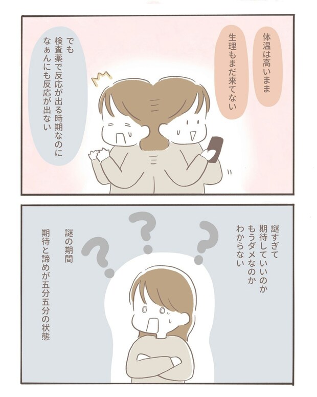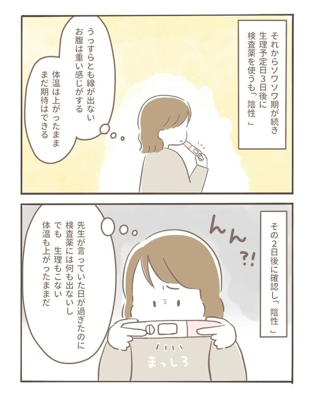 生理予定日になっても生理がこない。検査薬を試してみても結果は「陰性」のまま。期待してしまう気持ちと、また生理が来てしまうのではないかという不安が入り混じり、coromoさんの心は揺れ続けていました。