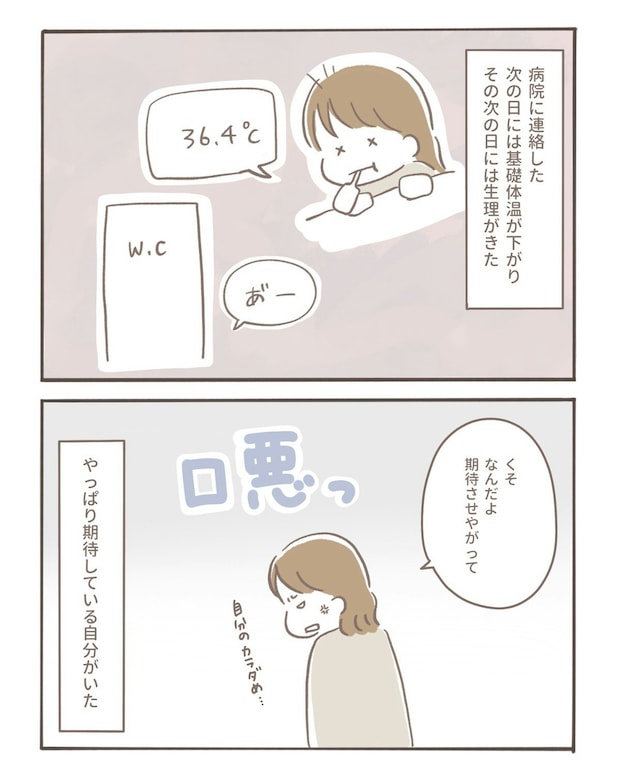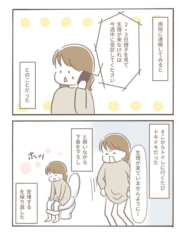 陰性のままなのに生理はこない──その状況が続き、coromoさんの心は期待と不安でいっぱいに。トイレに行くたびにドキドキしてしまう、落ち着かない日々が続いていました。