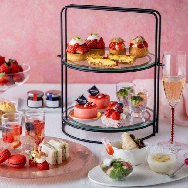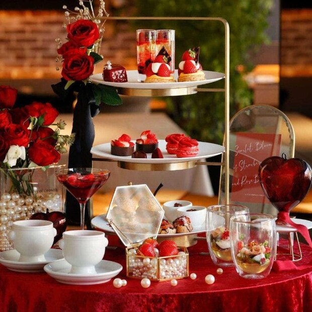 赤やピンクを基調としたメニューには、旬のいちごを主役にしたムースやシュークリーム、さらにはいちごのシャンパンカクテルも用意。セビーチェやパストラミサンドといった、多国籍料理の要素を取り入れた塩味のあるセイボリーも充実しているので、甘みとうまみの絶妙なバランスを堪能できる。ディナー限定の特典としてアルコールが2杯付くプランがあるうえ、3時間制という贅沢な時間設定もうれしい。