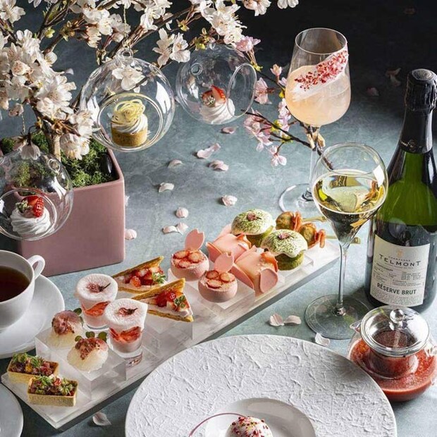 Telmont Champagneのグラスを傾けながら味わうのは、桜鯛のカルパッチョやミラノサラミといった、ワインと相性抜群のセイボリー。そして「サクラミルフィーユ」や「桜餡パフェ」など、アートのように美しいスイーツもずらりと並ぶ。さらにハイティーでは、いちごやカップケーキが実る「さくらツリー」がテーブルを美しく演出。「桜とピスタチオのムース・あまおうのスープ仕立て」や、桜色のスペシャルドリンクも本プラン限定で登場する、まさにプレミアムなセットに心躍らせて。