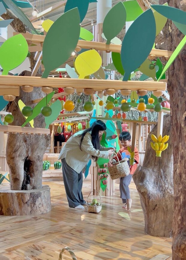 沖縄で採れるフルーツの収穫体験ができるエリアでは、木の果物をカゴに入れて「いっぱい採れた! 」と大はしゃぎ。