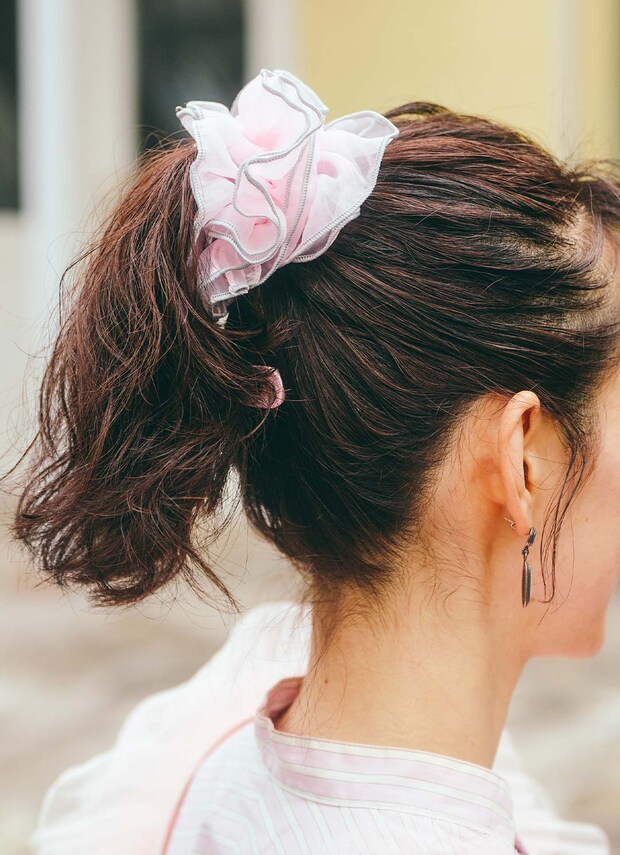 『スリーコインズ』のシュシュはピンクをセレクトしてとことんピンクコーデを満喫。ウェービーヘアで動きを出したのがグッド!