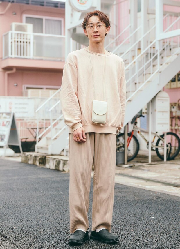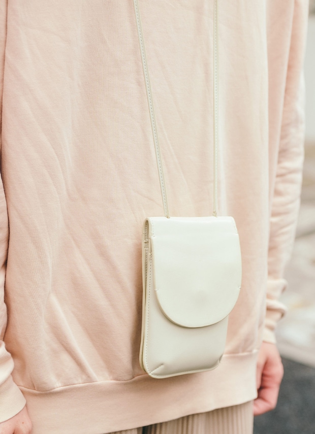ホワイトのネックポーチが、アクセサリー代わりに大活躍! シンプルなトップスを、上品に格上げしてくれるアイテム。