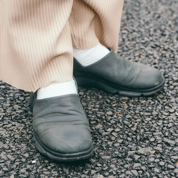 足元は『オルフィック』のブラックレザーシューズで、全体を引き締めて。丸みのあるフォルムがこなれムードを加速!