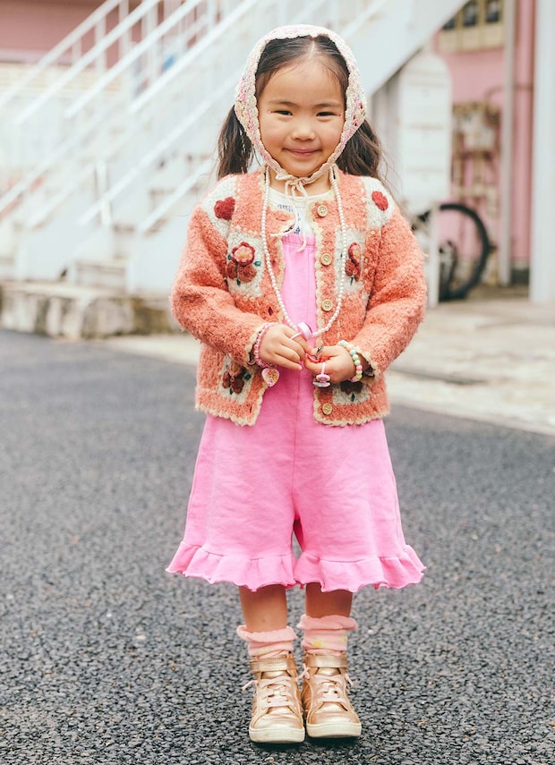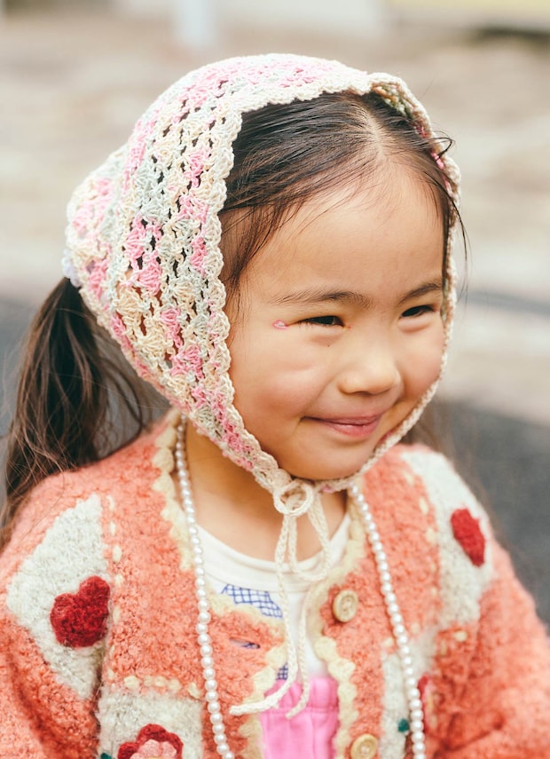 パステルカラーのバブーシュカで、春ムードな顔周りにアップグレード! きらめくネックレスをつけて、キッズのテンションもアップ!