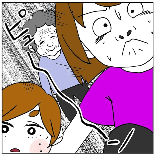 マダムの話を遮り、その場を後にしたことで、解放されたと胸をなでおろすシオリさん。ところが、マダムはずっとシオリさん親子を追いかけてきます。なんとか早歩きでマダムから逃れようとするシオリさんでしたが…。