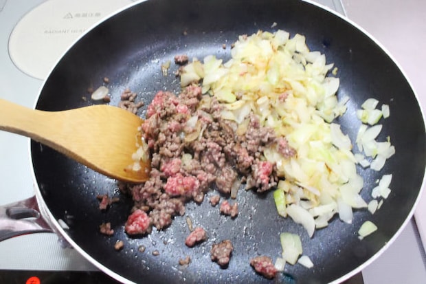 ひき肉の色が変わったら玉ねぎと混ぜ合わせ、塩とこしょうで味付け。強めの中火に火力を上げると、玉ねぎが焦げ付きやすいので注意しながら混ぜました。