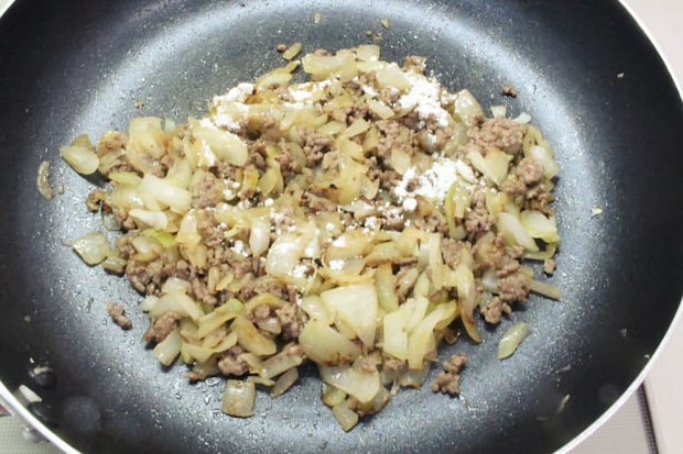 薄力粉はグルテンを含むので、加えてから良く混ぜるようにして炒めると、ひき肉と玉ねぎがより密着して一体感が出るのではないかと感じました。