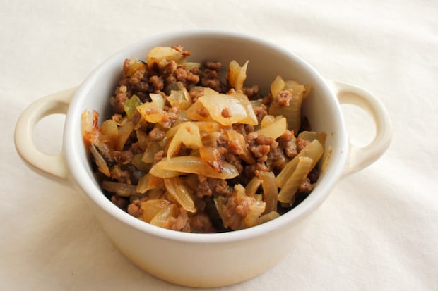 薄力粉を加えて具材をまとまりやすくするのがポイントです。1分ほど炒めると、ポロポロとしたひき肉と玉ねぎが少しまとまりました。