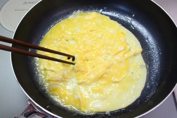 バターが溶けたフライパンに、塩とこしょうで軽く味付けした溶き卵を流し入れると、1分もしないうちに卵が固まりだしたので、素早くかき混ぜて半熟状に焼きました。