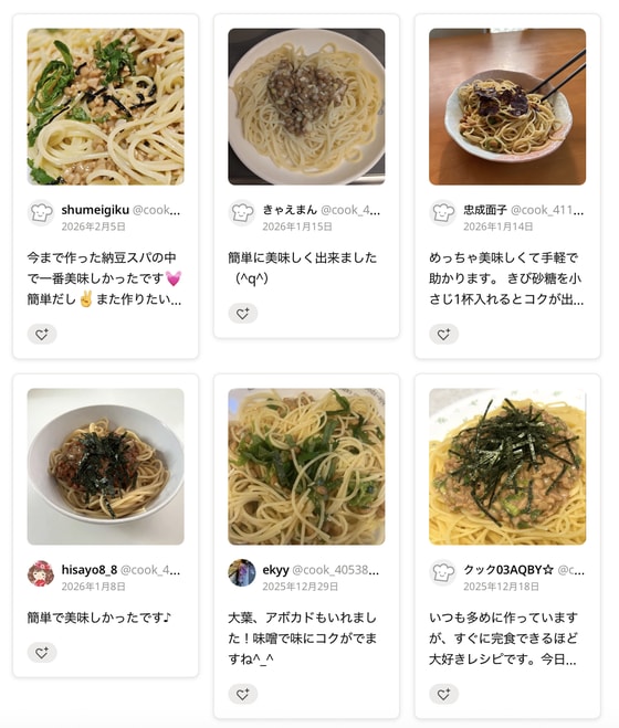 つくれぽ(つくりましたフォトレポートのこと)にも「今までの納豆パスタの中で、一番おいしい」「簡単なのにすごいおいしく助かるレシピ」「子どもも大喜びで、何度も作っています」などの嬉しい声が3000人以上から届いています。