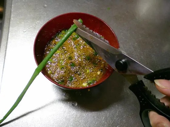 2.納豆、めんつゆ、味噌を混ぜます。ねぎをキッチンバサミで切りながら加えれば、包丁いらず。