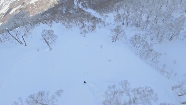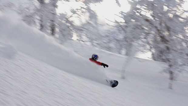ハーフパイプを滑る彼とは違う、全身で滑りを楽しみパウダーを上げる姿に、クルー全員の顔もほころんでいく!!