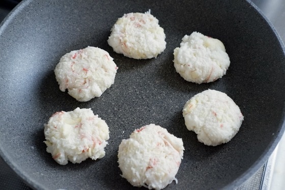 3.濡らした手で適量をとり、小判型にまとめてフライパンに並べます。