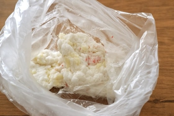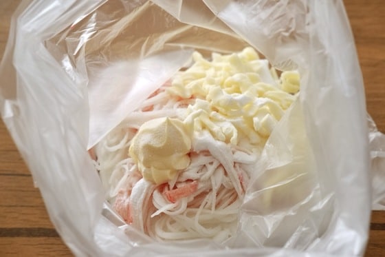 1. はんぺん、カニカマ、ピザ用チーズなどの食材と調味料をすべてポリ袋に入れます。