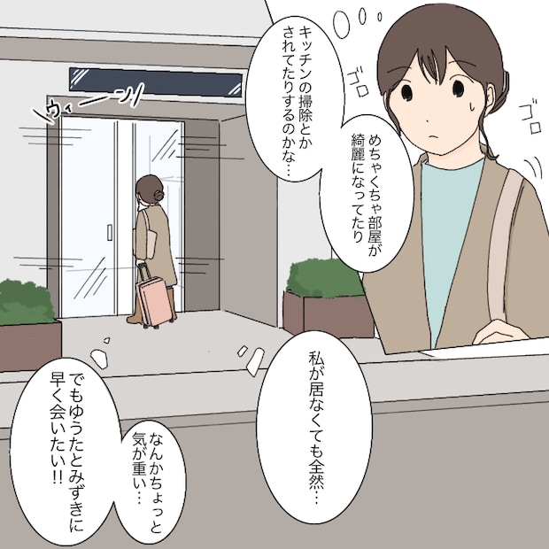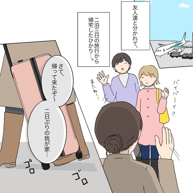 ゆきとみゆと別れて、2泊3日の旅行から帰宅した私。出産ぶりに子どもたちのお世話から解放されて自由な時間を過ごせたおかげで、心も体もすっかりリフレッシュ。スーツケースを転がしながら、2日ぶりの我が家へと向かいます。メッセージでは余裕そうだったものの、やっぱり夫と子どもたちのことが気になり、自然と足取りが早くなります。