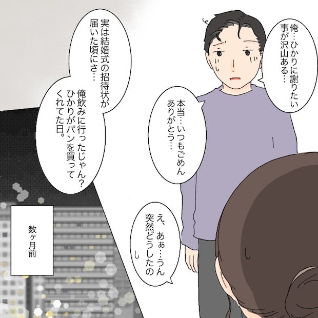 「なに、ごと・・・」と声を漏らすと、夫が「俺、ひかりに謝りたいことが沢山ある・・・本当いつもごめん、ありがとう」と突然感謝の言葉を口にしました。「突然どうしたの?」と聞くと、夫は数ヶ月前に起きた出来事を語り始めました。