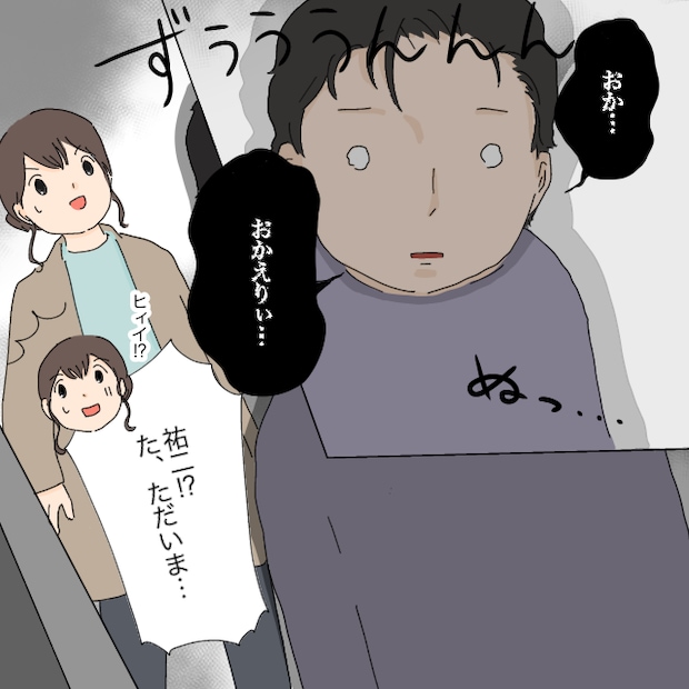 するとリビングから、生気を失ったような夫がぬるりと姿を現しました。「おか・・・おかえりぃ」と、今にも消えそうな声でつぶやきます。あまりの様子に驚いて、私は「裕二!?た、ただいま」と慌てて声をかけました。