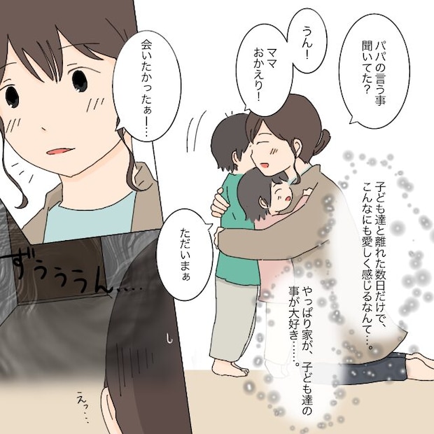 「パパの言う事ちゃんと聞いてた?」と聞くと、ゆうたとみずきは「うん!ママおかえり」と言って、私の胸に飛び込んできました。ほんの数日離れただけなのに、こんなにも愛おしく感じるなんて。やっぱり私は、この家も子どもたちのことも大好きです。ふと顔を上げると、リビングへ続く廊下がどんよりして見えました。何か嫌な予感がする・・・。