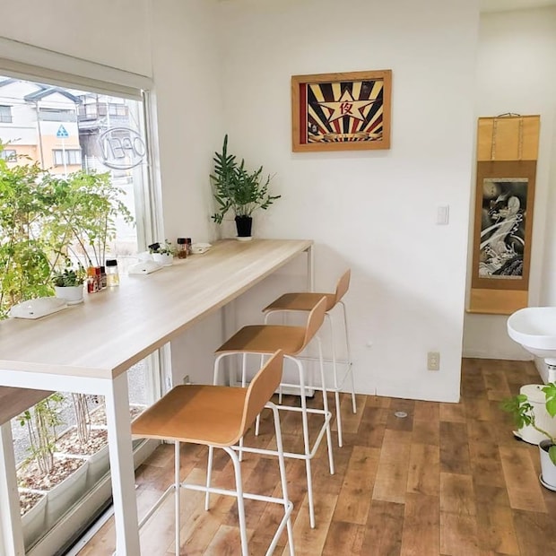 窓側に配置されたカウンター席は、大きな窓から差し込む自然光が心地よく、一人でも気兼ねなく食事を楽しめる開放的な造りになっています。