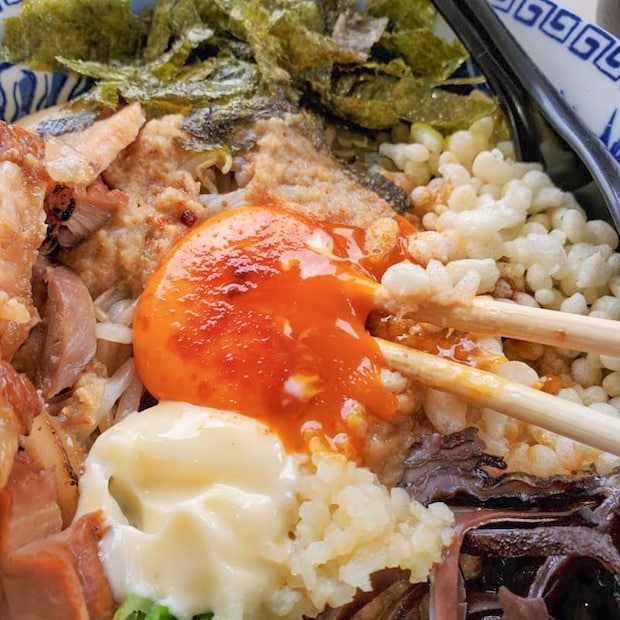 詳しくは企業秘密だという特製ダレ、濃厚な卵黄、そして多彩なトッピングを麺が熱いうちに混ぜ合わせることで、タレの力強い香りとネギや海苔の風味が渾然一体となって溢れ出してきます。