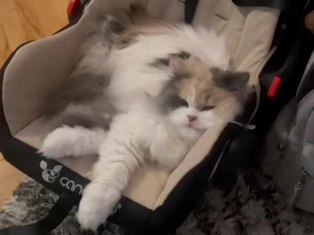 ベビーシートの中にふわふわの体を