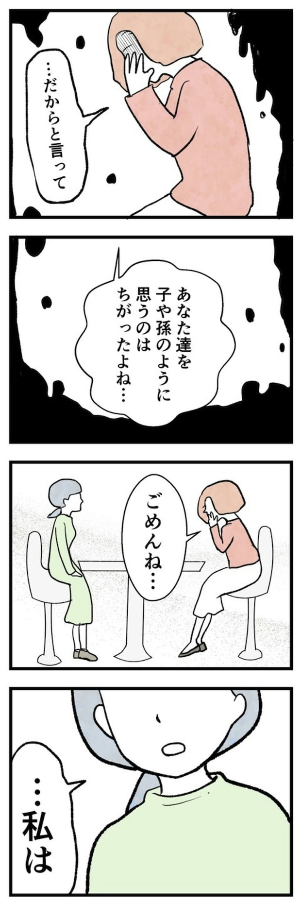 まゆさんに「友達として接してほしい」と言われ、喜美子さんは少しずつ本音を語り始めました。昔は親戚や周りの子どもたちに囲まれてにぎやかだったけれど、成長や別れを経て気づけばひとりに。