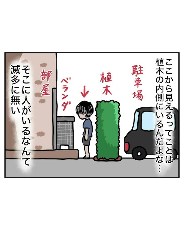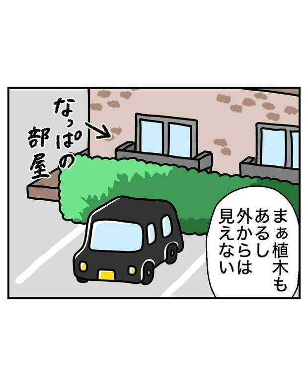 一人暮らしを楽しんでいる大学生の主人公・なっぱさん。窓に取り付けたカーテンの長さが足りませんが、外には植え込みがあるため、大丈夫だと思っていました。