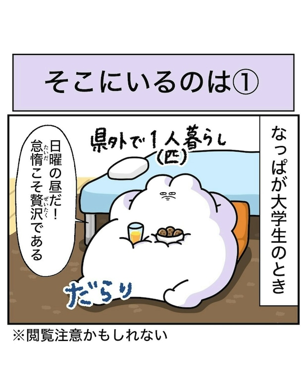 なっぱさんがDVDを観ようとしたとき、ふと窓の外を見ると、人のようなものが横たわりこちらを覗いています…。なっぱさんは、何が起きたのかわからず、外の人物に声をかけてみようと立ち上がります。