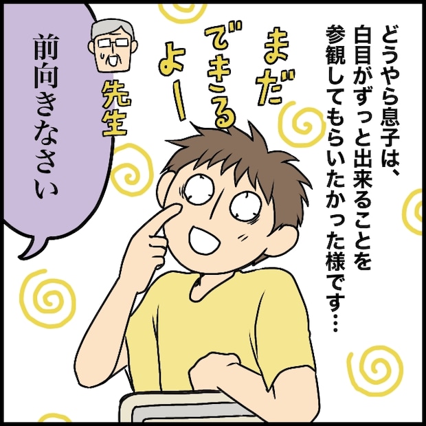 ついに先生から「前を向きなさい」と注意されてしまい、それをきっかけにクラスメイトたちは大笑い。私は顔から火が出るほど恥ずかしい思いをしました。どうやら息子は、一生懸命授業を受ける姿ではなく、白目が出来ることを参観してもらいたかったようです。・・・白目は家でもできるよね?