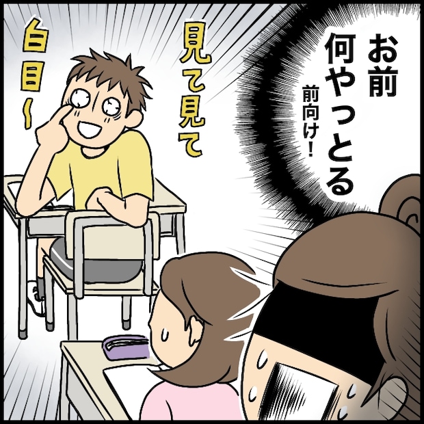 そこには、教室の後ろに立つ私の方に振り返って「見て見て~」と白目をむく息子の姿が!クラスメイトは真剣に先生の話を聞いているのに、ふざけているのはうちの息子だけ。私は心の中で「お前何やっとる!前を向け!」と叫びました。