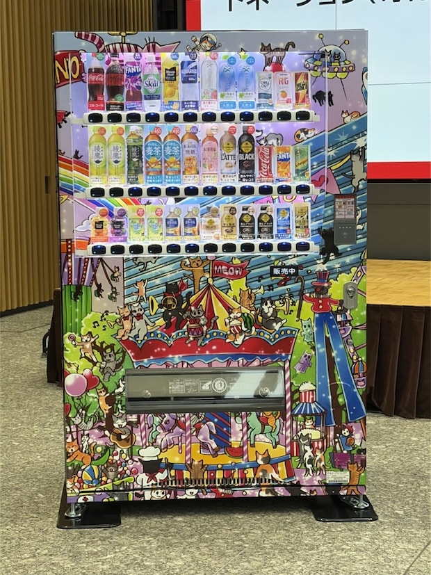 中川翔子さんがラッピングをデザインしたオリジナル自販機、中野四季の森公園の空想の遊園地で楽しむ猫たちを描いた