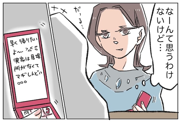 みんな幸せそうでなにより・・・なんて思うわけないけど。この幸せそうな空間から、一刻も早く逃げ出したい。帰ってきて思ったけど、やっぱりこの家に私の居場所はありません。私はこっそり携帯を取り出すと、リョウに「早く帰りたいよ~実家は居場所がなくてマヂしんどい」とメールを送りました。