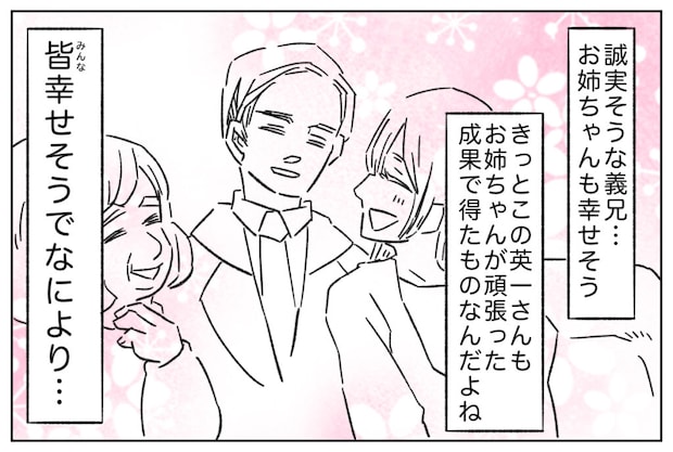 誠実で高学歴な義兄。こんな人が結婚相手で姉も幸せそうです。英一さんも、姉が努力して得た成果のひとつなのでしょう。母も父も反対することなく終始笑顔。きっと近所の人にも、鼻高々に自慢しまくるに違いありません。
