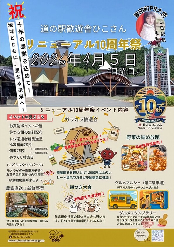 The post 【添田】4月5日(日)、道の駅歓遊舎ひこさんで「リニューアル10周年祭」が開催されます! first appeared on 筑豊情報マガジンWING.