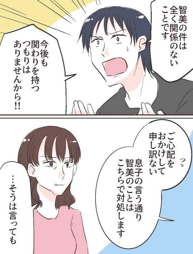 お母さんの言葉を聞いて修吾は慌てました。智美さんが実家に入り浸っているものの修吾にとっては小さい頃に一緒に遊んでいたきりの隣人で、実家を出てからは全く連絡を取っていなかった存在なのですからお母さんが結婚に物申すような雰囲気を出したことに慌てるのはすごくわかりました。でも実際に結婚することになったら既に疲弊するほどに関わってきているし・・・。今後も修吾は智美さんと関わりを持つつもりはないと宣言しました。義父も、智美のことは義父たちで対処するとお母さんに訴えましたが、お母さんは「そうはいっても」と淡々と返しました。