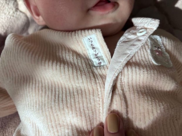赤ちゃんが着ているのは、淡い色合いの優しい生地。胸元のタグには、小さく「いつもありがとう」の文字と、小さなハートが書かれています。