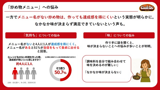 「『炒め物』は約4日に1回出現するビッグメニューであることがわかった」といいます。炒め物は出現頻度が高いからこそ各家庭には悩みがあるようで、「ひとつは気持ち面。炒め物は名前がなく、食卓に出すときに4人に1人が達成感を覚えにくいという調査結果が出た」そうです。