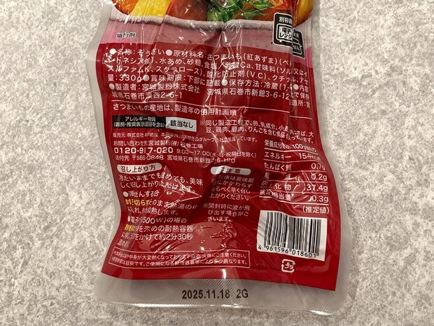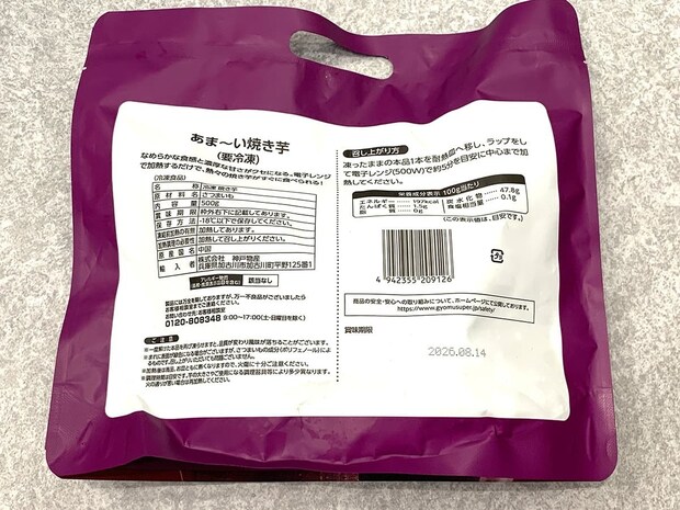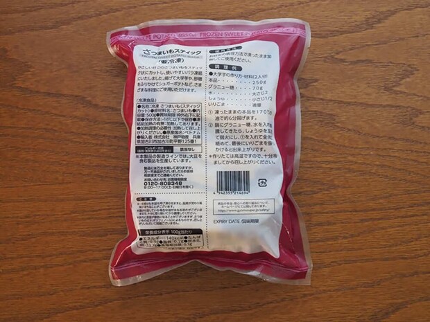 冷凍品が多い業務スーパーのさつまいもですが、本品はチルド商品。それでも賞味期限は約2ヶ月で設定されていたので、期限切れの心配はあまりなさそうです!