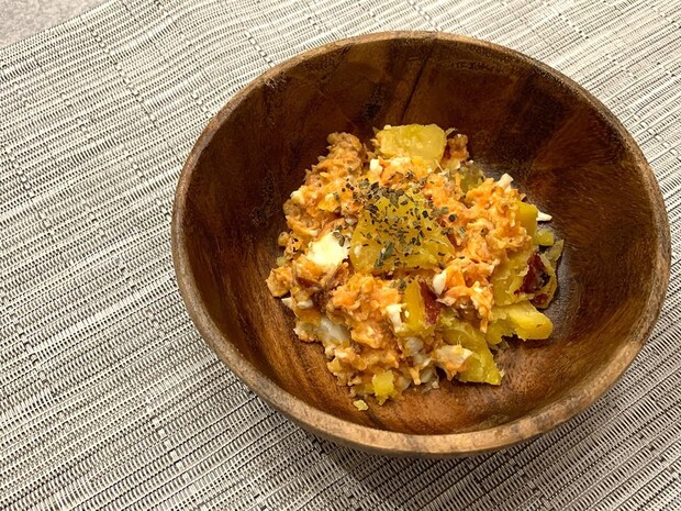 アレンジ料理として、にんじんと卵のサラダにさつまいもの甘煮を加えてみました。